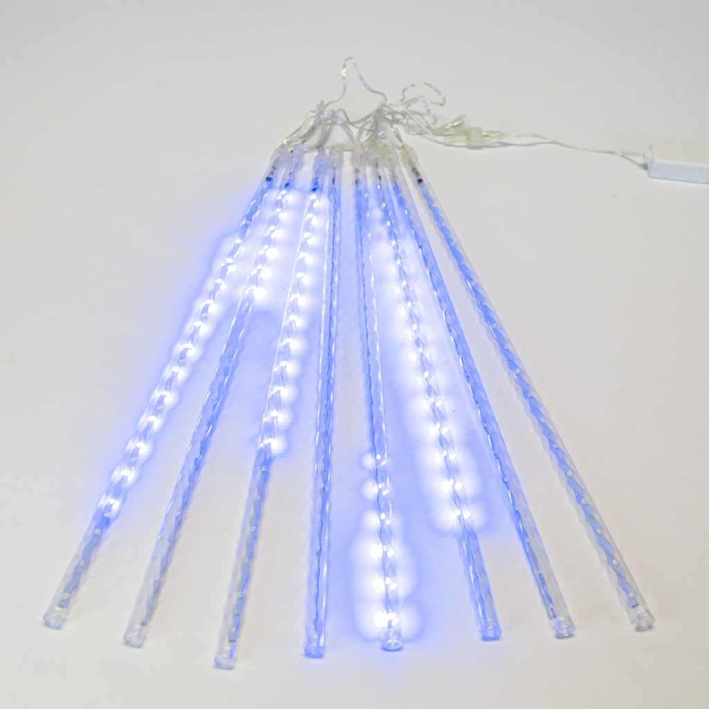 Meteoro Snowfall 50cm Azul, Prova D´agua, Visão Led Dupla Face, Conexão Macho X Fêmea, Caixa com 50 Conjuntos, Cada Conjunto tem 08 Tubos de 12mm de Espessura por 50cm de Comprimento, Cada tubo contem 48 Led (Tamanho da Caixa 63x24x48cm Peso 12kg)